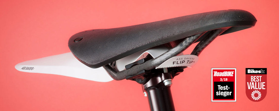 Ass Saver, the original saddle mudguard or seat fender, fits to the rails of your saddle and requires no eyelets or specific tire clearance, making it perfect for road bikes, track bikes and gravel bikes where a full set of mudguards is not technically possible or desirable. Attaches in seconds without tools and offers basic protection against dirt.