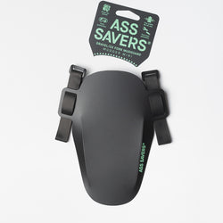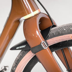 The specially designed straps have enough friction to prevent the mudguard from sliding down on a conic fork leg. However, it needs to be tighten firmly to stay up. The open ended design of the strap will allow you to adjust the length and thereby center the position of the ASS SAVERS logo on the fork leg. You can also inverse the strap if you prefer to have a no-logo appearance.