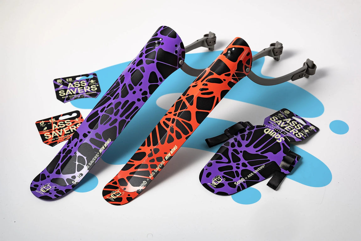 The magical but limited collab of "The 128", together with SQUID bikes resulted in 128 unique Ass Savers Win Wing Gravel in a never seen before hand-meets-industry-series. What you see here is the permanent collection that gives you the opportunity to SQUID your bike even if you missed the opportunity of getting your hands on one of the orignal 128. The pattern of the SQUID collection boils down the essence of what SQUID does in one of their most iconic painting techniques, using randomly spread dishwashing soap as their masking tape.